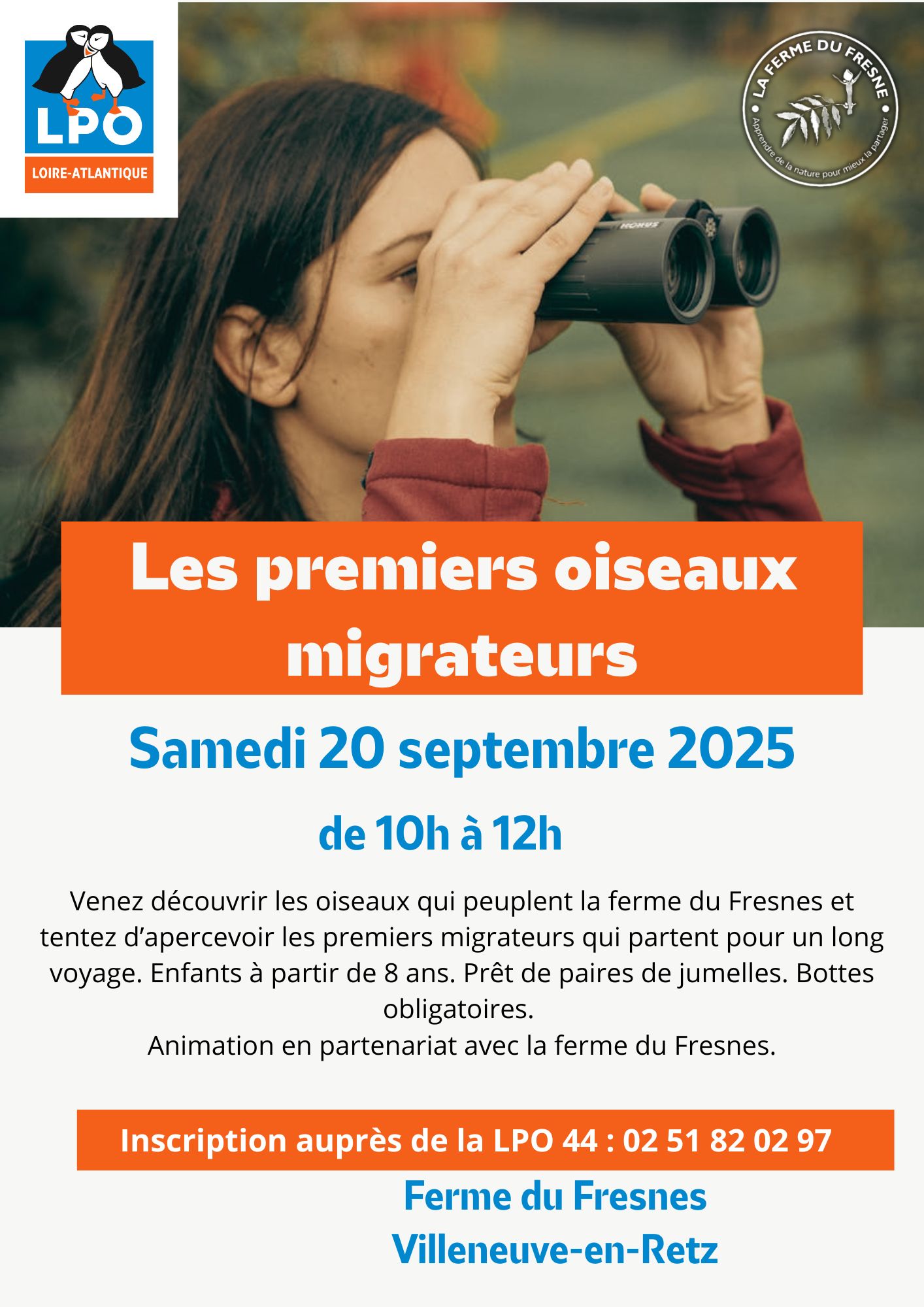 Le samedi 20 septembre 2025, de 10h à 12h, venez vivre une expérience unique à la Ferme du Fresne avec la LPO Loire-Atlantique : observer les premiers oiseaux migrateurs qui s’envolent pour un grand voyage.